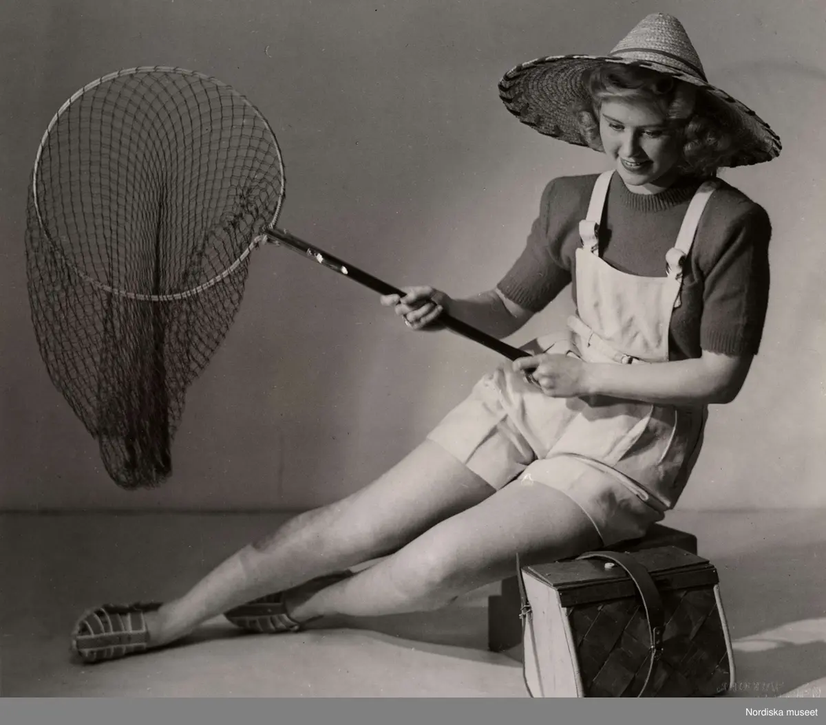 Sommarmode från varuhuset Nordiska Kompaniet i Stockholm 1944. En kvinnlig modell iklädd korta hängselbyxor, tröja, stråhatt och sandaler sitter med en fiskehåv i handen. Vid hennes sida står en väska av flätat näver.