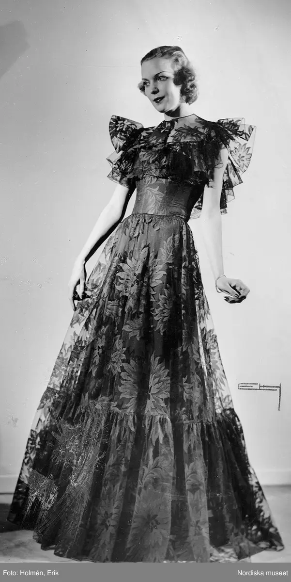 Modell i aftonklänning med nattblå, grov spets.