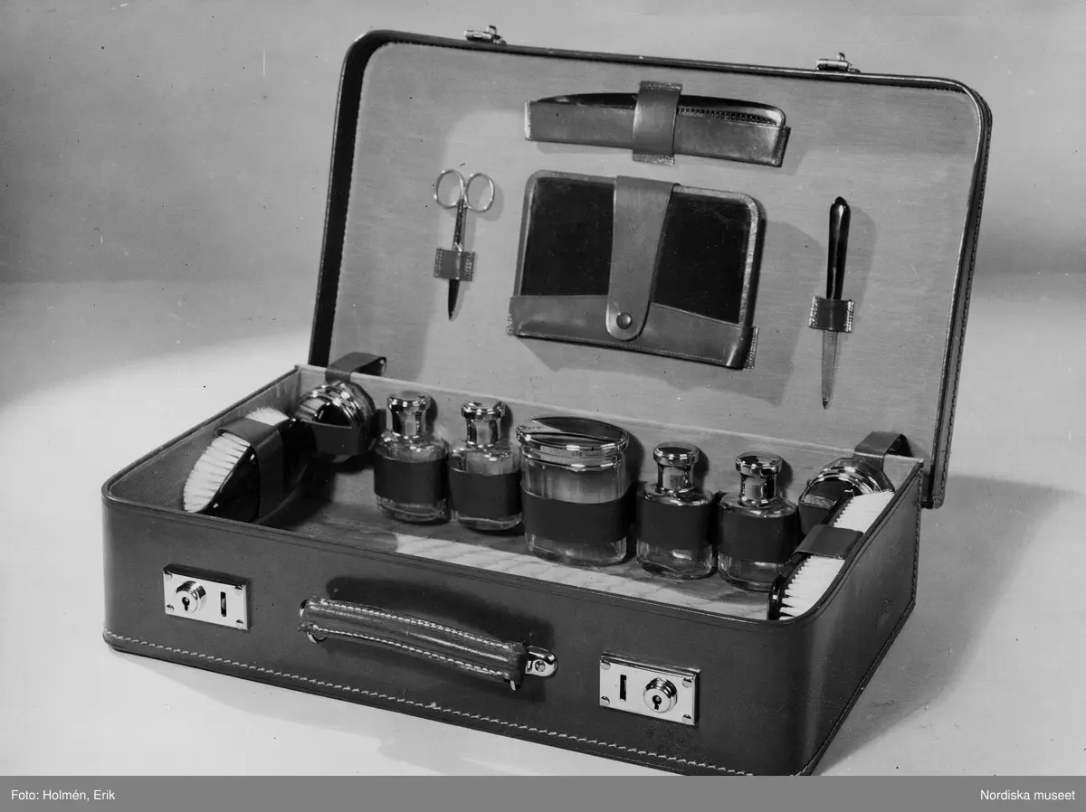 Reseffekter. Portfölj innehållande nagelvård, flaskor och borstar.