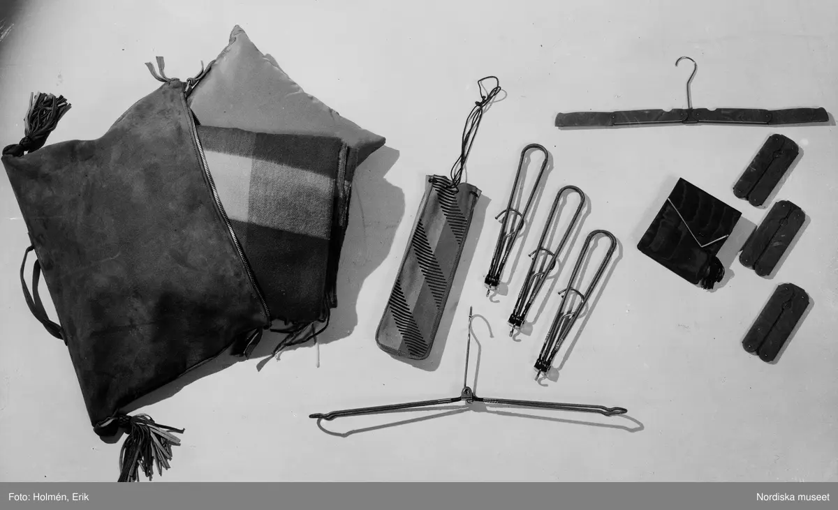 Reseffekter. Väska med fransar, kuddar och galgar.