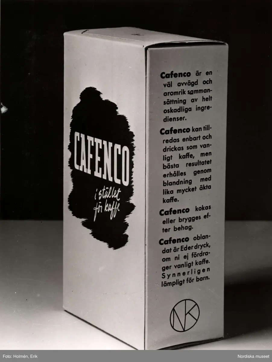"Cafenco istället för kaffe", förpackning med kaffesurrogat, Nordiska Kompaniet 1941.