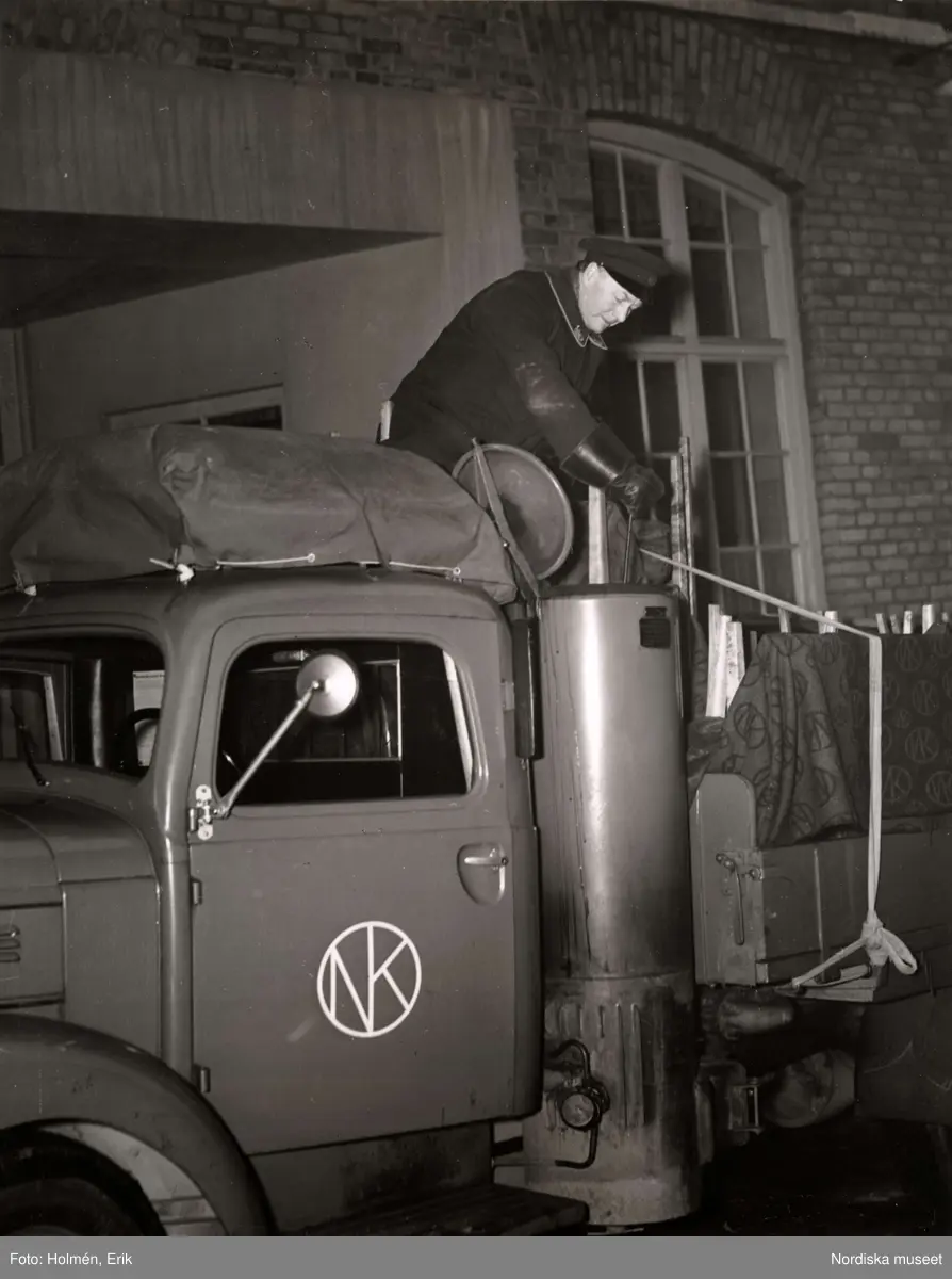 En uniformklädd man lastar Nordiska Kompaniets första gengasbil 1941.
