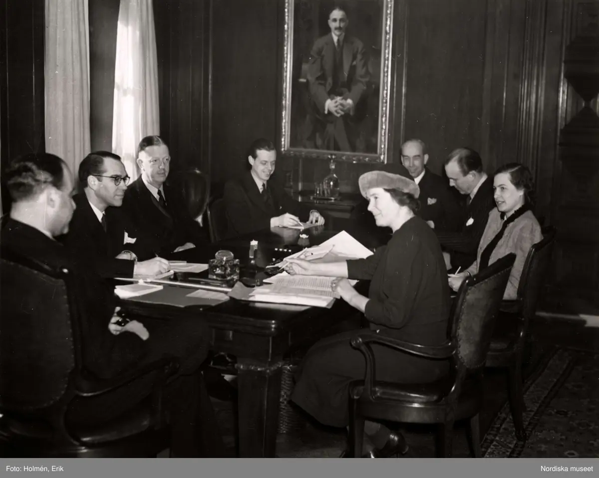 Nordiska Kompaniets budgetkomitté. En grupp män och två kvinnor sitter kring ett ovalt bord. Ovanför ena kortsidan på väggen att mansporträtt, troligen föreställande Josef Sachs.