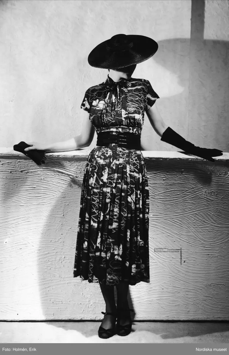 Mode; klänningar. Kvinna i mönstrad långklänning samt hatt och handskar. Nordiska Kompaniet.