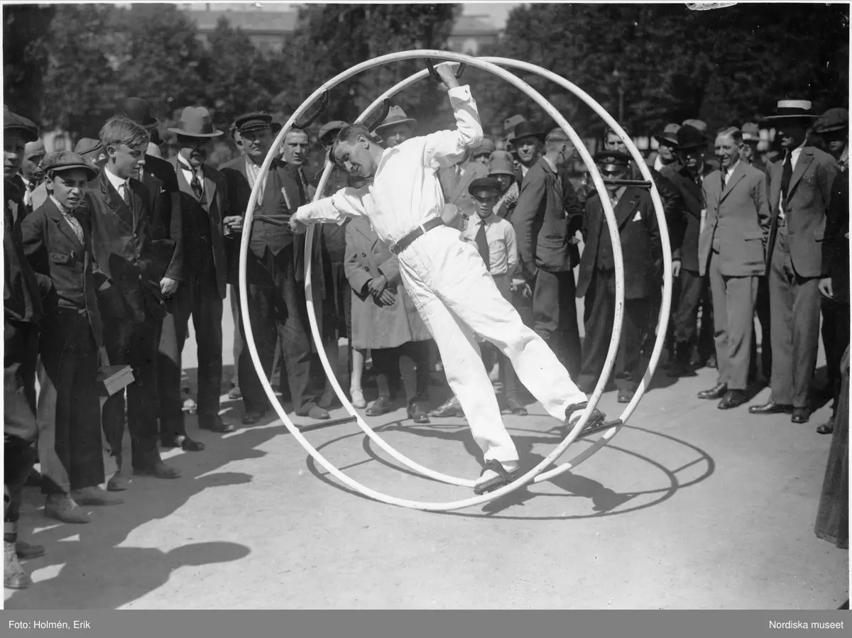Titel: Demonstration av motionshjul i Kungsträdgården, Stockholm. Nordiska Kompaniet.