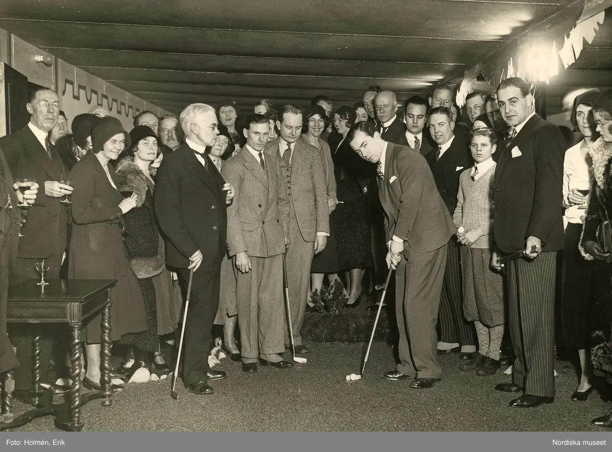 Män spelar golf inomhus inför publik, Nordiska Kompaniet.