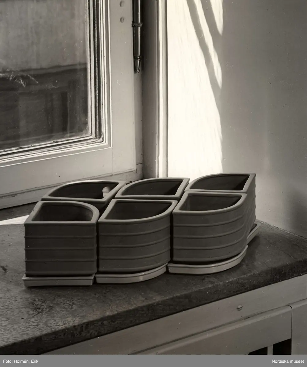 Blomkrukor på fönsterbräda. Formgivna av Wilhelm Kåge. Utställning, AB Nordiska Kompaniet, NK.
