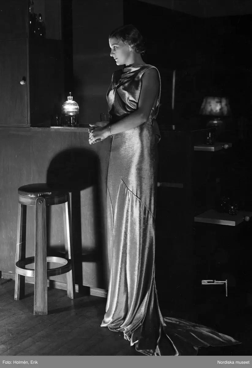 Modell i chartreusefärgad aftonklänning, velourtransparant.