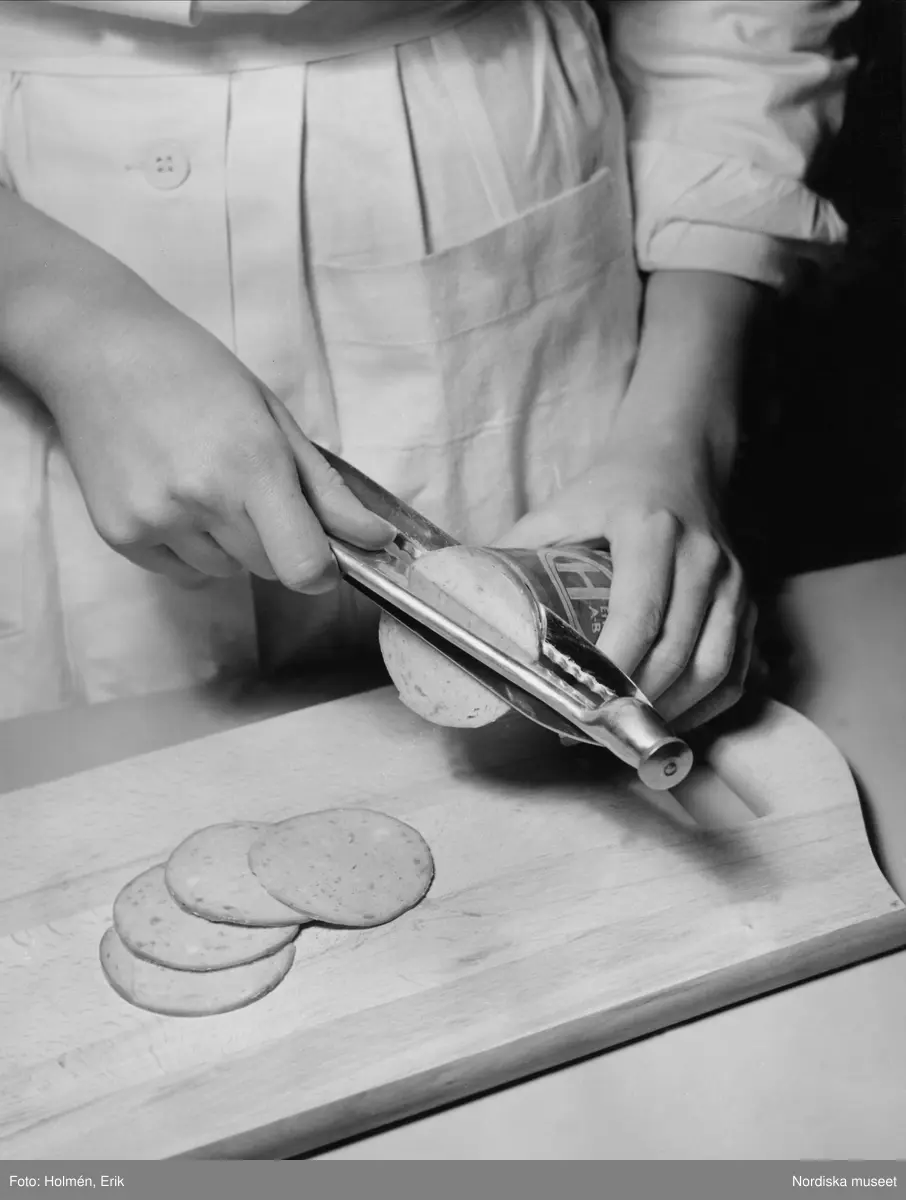 Brud och hem, Nordiska Kompaniet. Kvinna skivar korv med specialredskap.