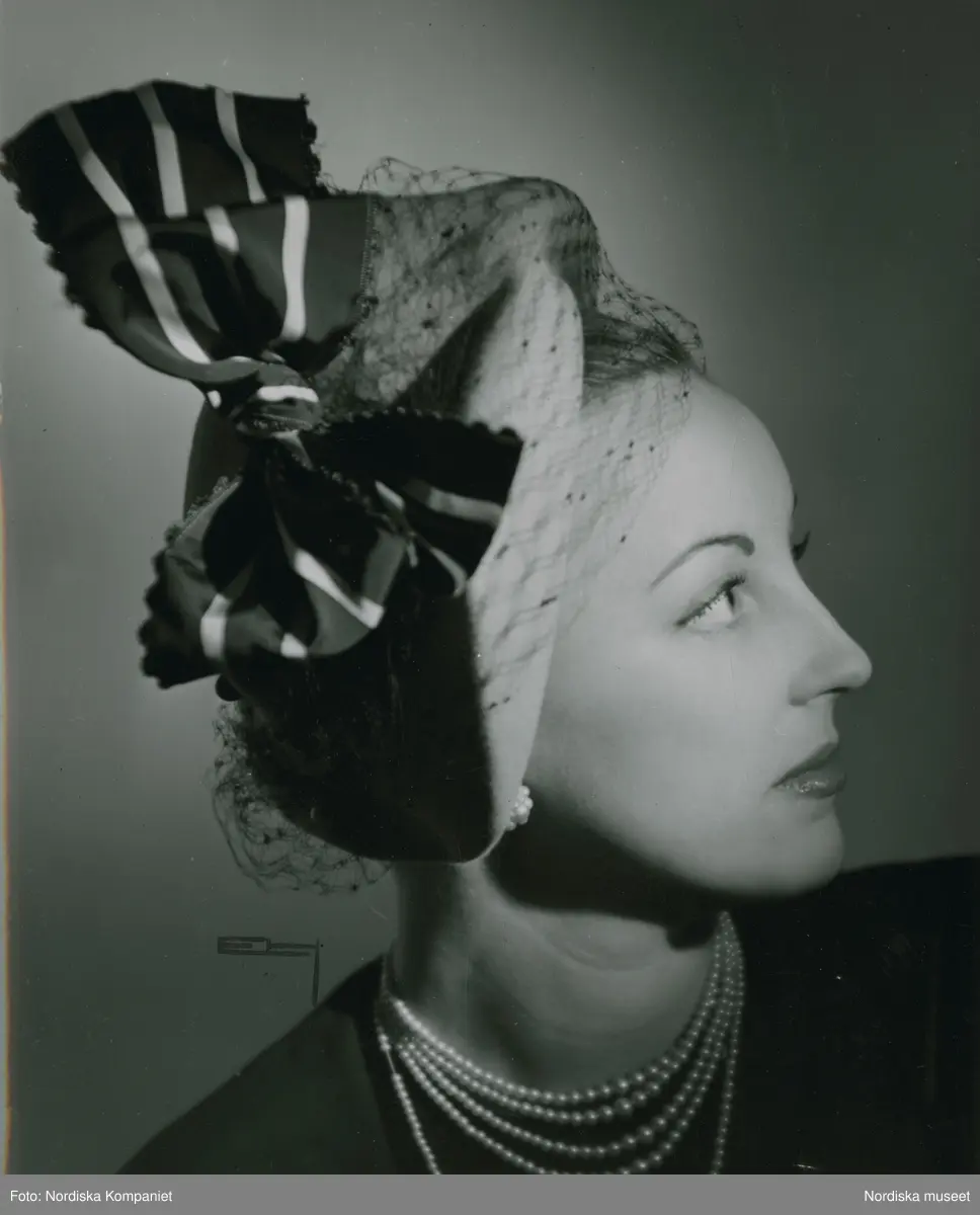 Modell i platt hatt placerad på ena sidan av huvudet. Randig rosett, flor.