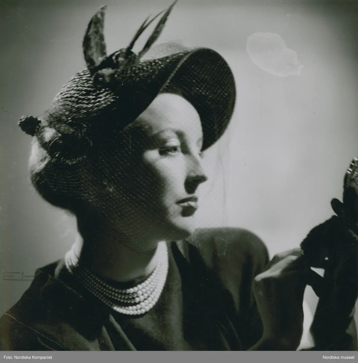 Porträtt av modell i stråhatt med fågeldekoration och flor, pärlhalsband.