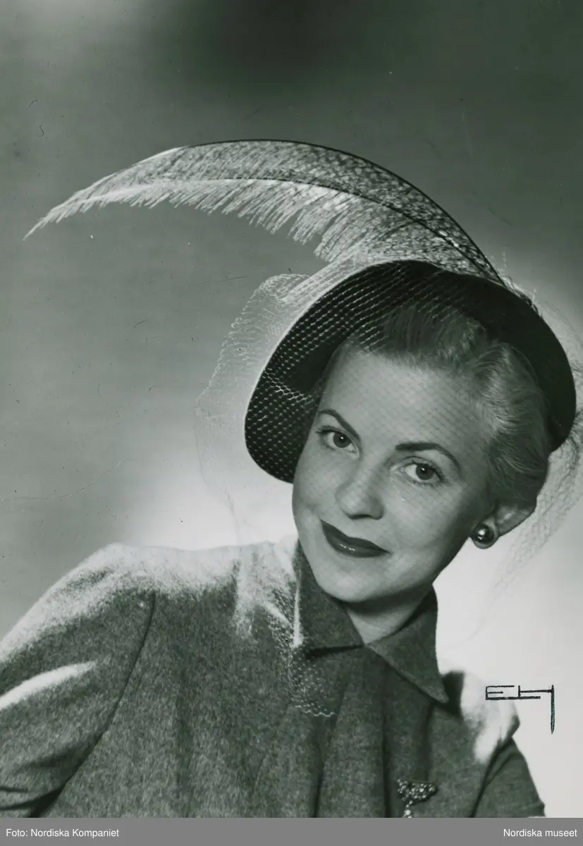 Porträtt av modell i hatt av grön antilopfilt, monterad med penna i brunt och beige. Av Rose Descat, Paris.