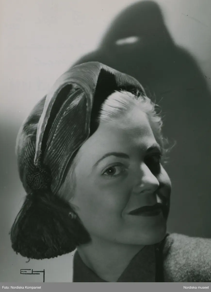 Porträtt av modell i guldbrun helstickad sammetshatt med tofs i silke. Av Claude S:t Cyr, Paris.