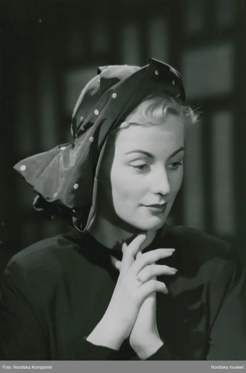 Porträtt av modell i hatt med ljust marinblått failleband med vita prickar.