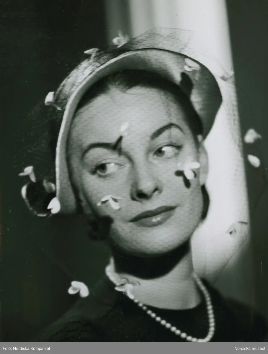 Porträtt av modell i hatt, flor med blommor. Av Gilbert Orcel.