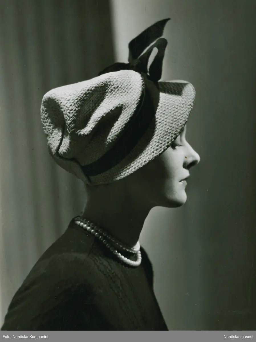 Porträtt av modell i hatt med dekorband och tvåradigt pärlhalsband.