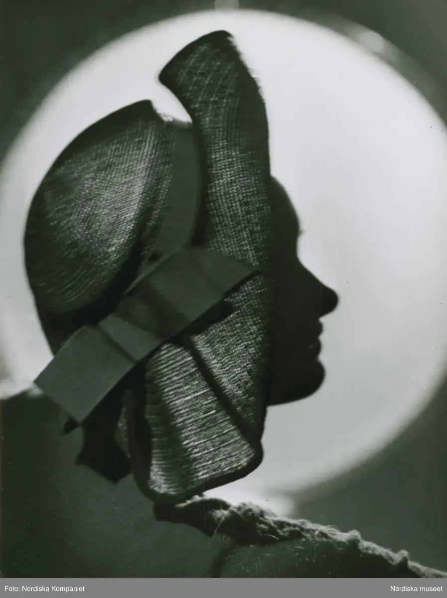 Porträtt av modell i hatt med ripsband. Cirkelformat ljus i bakgrunden.