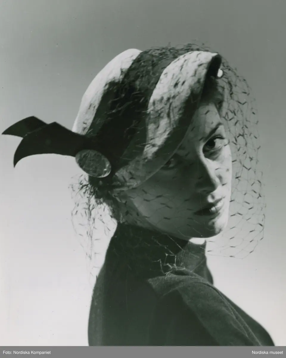 Porträtt av modell i citrongul stråhatt med blå bandmontering och flor, av Jacques Fath.