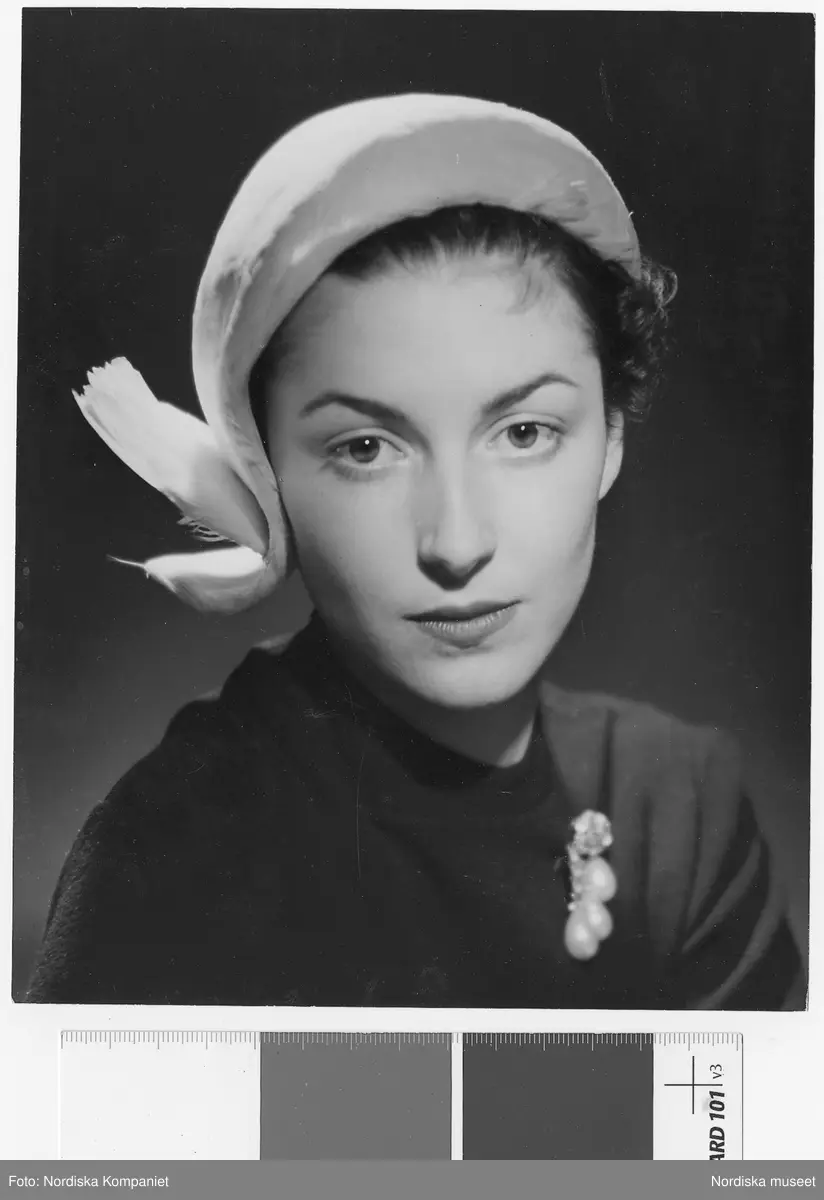 Porträtt av modell i vit hatt med fjäder, samt brosch.