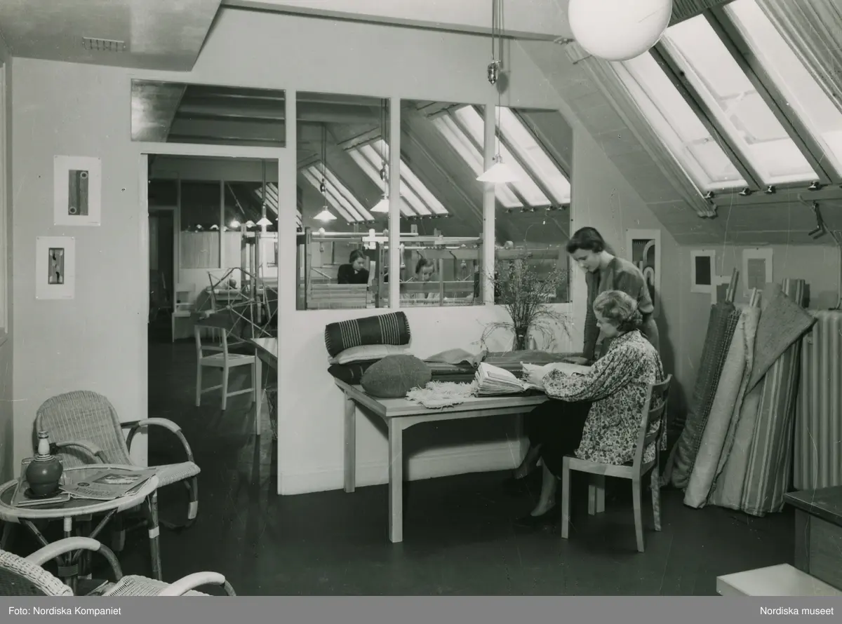 Nordiska Kompaniets Textilkammare. Astrid Sampe (sittande i blommig klänning) tittar på tygprover tillsammans med en medarbetare.