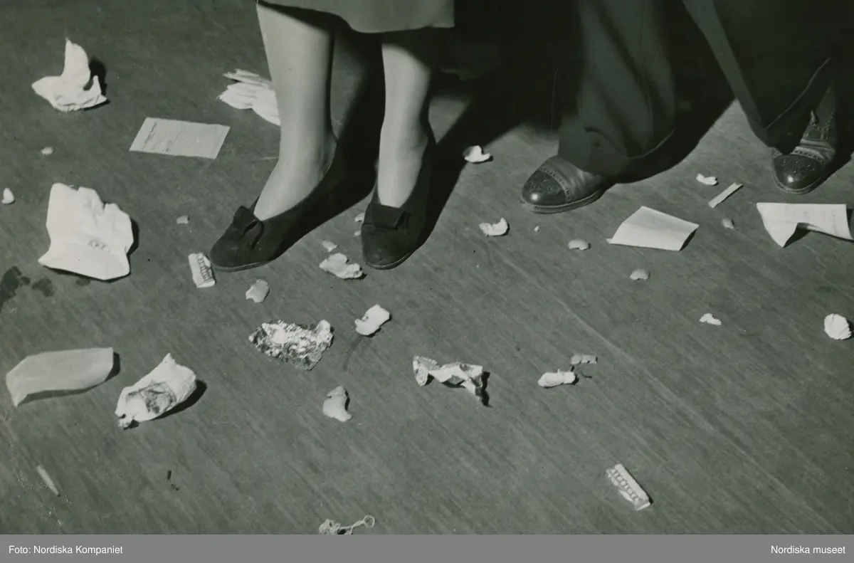 Mans- och kvinnofötter på ett golv med pappersskräp och apelsinskal. Text med blyerts på baksidan: "Div. bild. Papperspelle 1944".
