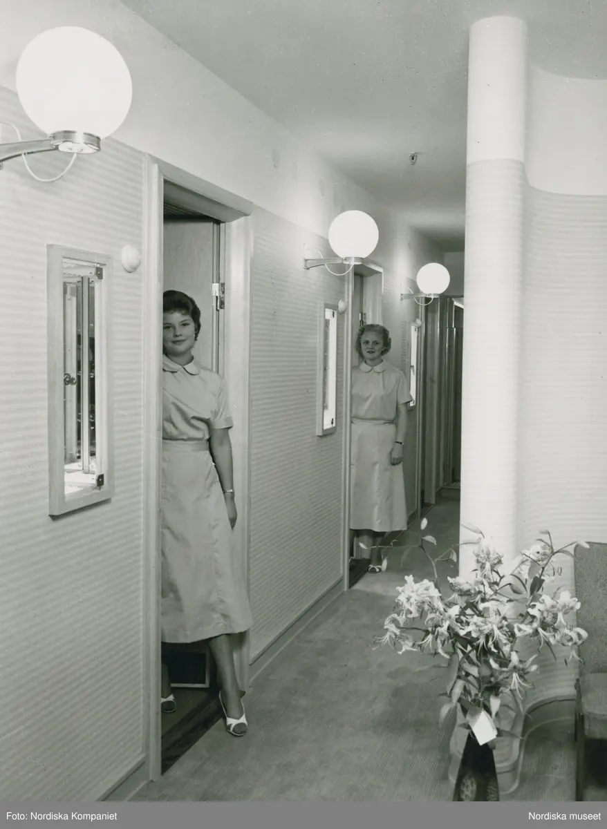 Två kvinnor i ljusa arbetsrockar står i varsin dörröppning. I förgrunden en golvvas med liljor. Nordiska Kompaniet.