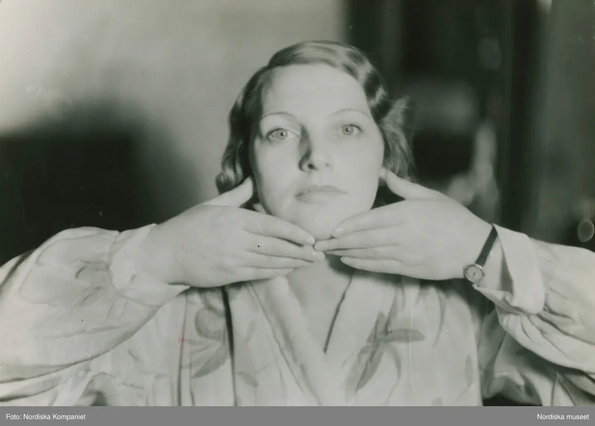 En kvinna masserar hakan. Nordiska Kompaniet. Text med blyerts på baksidan: "Hyg. avd. Ansiktsbehandling. Hösten 1930".