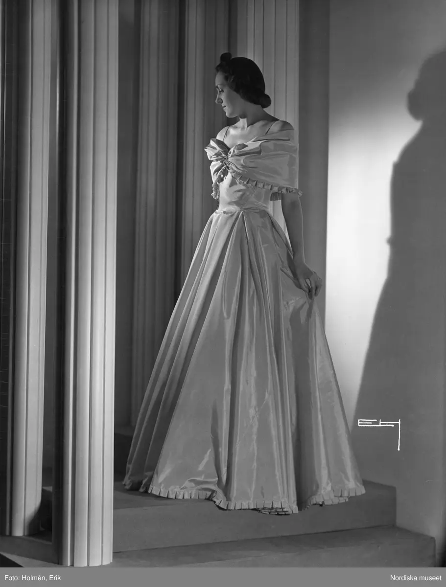 Modell i ljus balklänning i siden. Knuten sjal över axlarna. Ljusa draperier i bakgrunden.