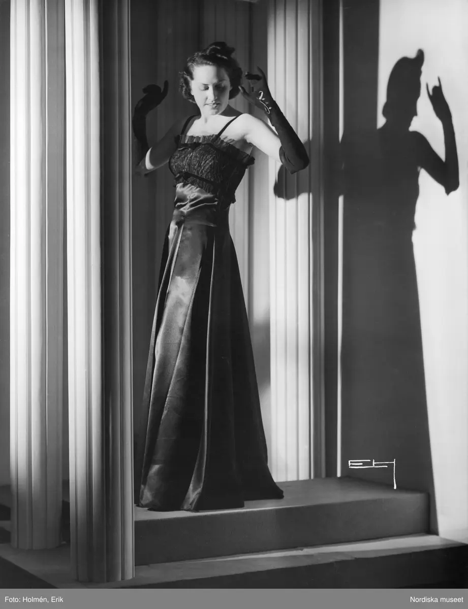 Modell i hellång aftonklänning och aftonhandskar. Står på en trappa med vita pelare.