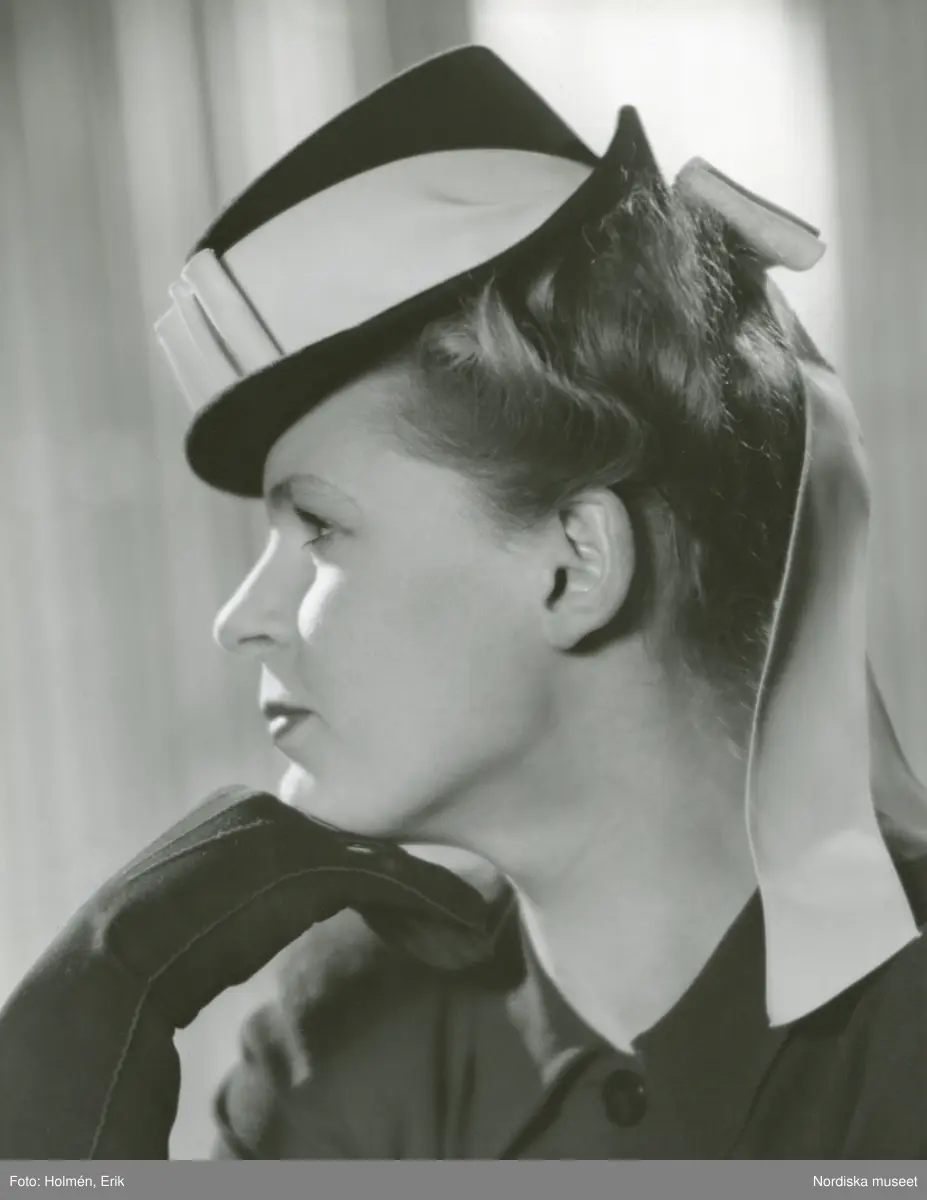 Porträtt av kvinna i hatt med ljust hattband och mörka handskar.