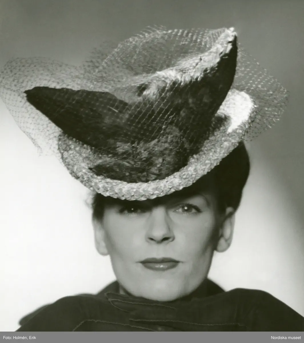 Porträtt av kvinna i stråhatt med fjädrar och tyll.