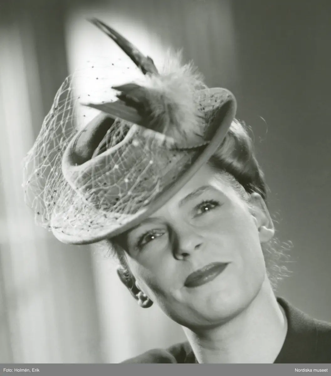 Porträtt av kvinna i hatt med flor och fjädrar.