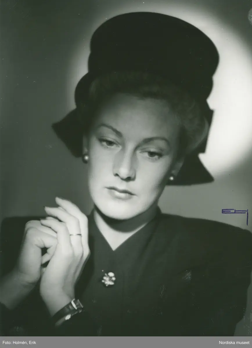 Porträtt av kvinna klädd i hatt, mörk överdel, örhängen och klocka.