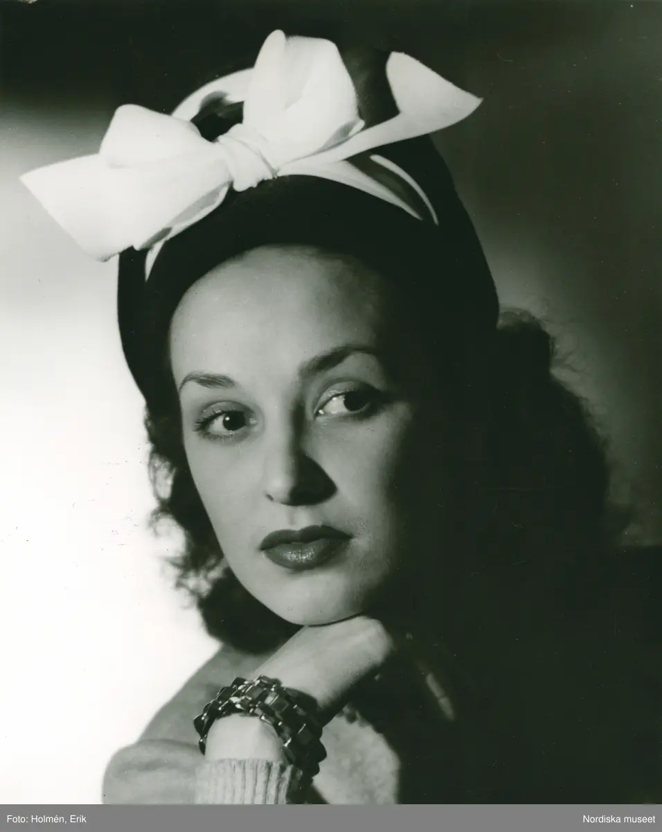 Porträtt av kvinna i hatt med vitt dekorband knutet i rosett, samt armband.