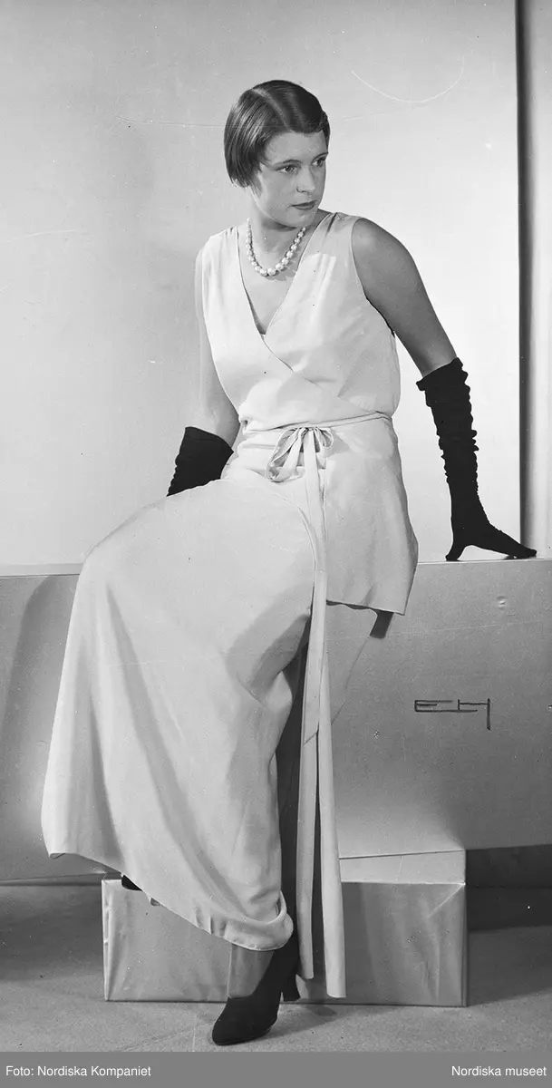 Modell i aftonklänning med omlottskärning, pärlhalsband, aftonhandskar och pumps.
