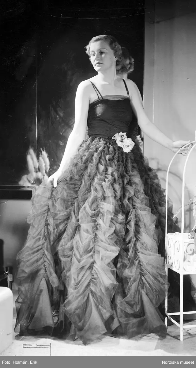 Modell i aftonklänning med kjol i veckad tyll och blomstergarnityr framtill. Från Edward Molyneux.