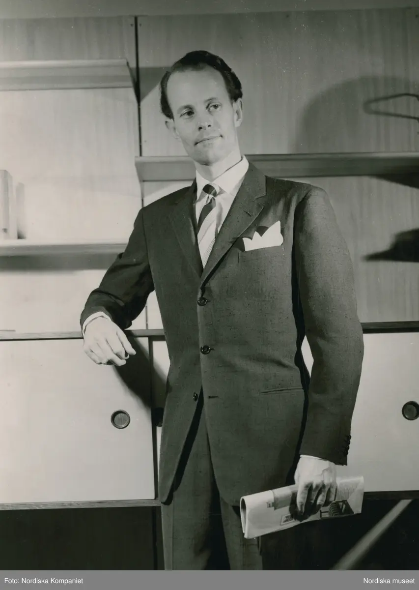 Man i kostym, vit skjorta och slips. Näsduk i bröstfickan. I handen en hopvikt tidning.