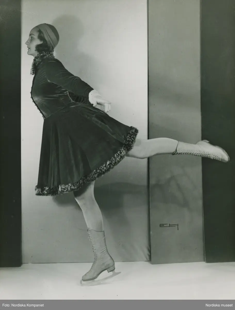 Kvinna i cirkelskuren skridskoklänning. Nordiska Kompaniet. Text med blyerts på baksidan: "EC sept 1931".