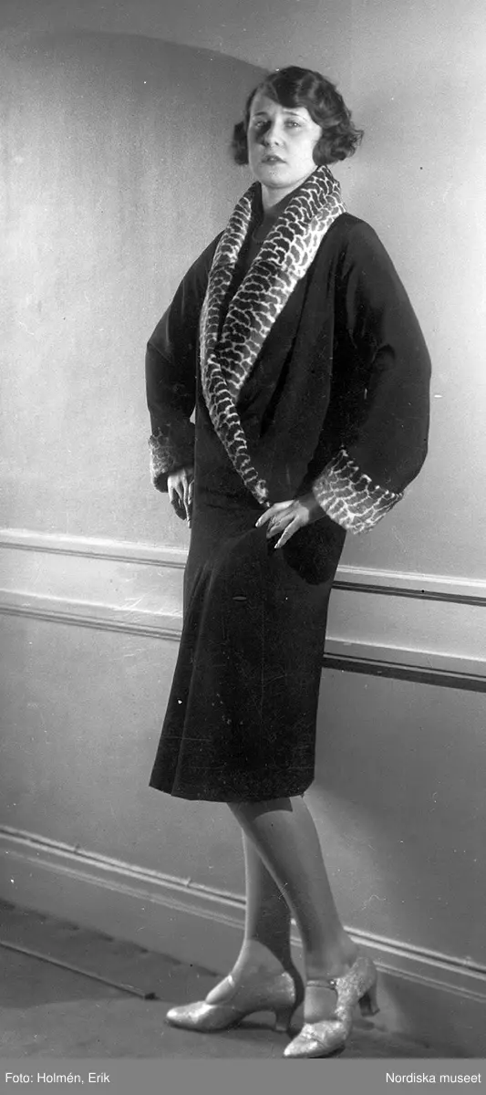 Kvinna poserar i klänning av svart crêpe, besats: pärlhöns.