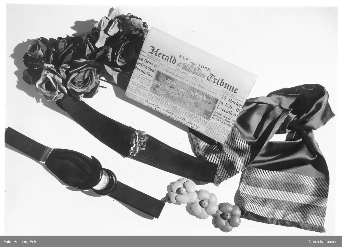 Kollage av accessoarer. Tidningen The Herald Tribune, skärp, sjal och blommor.