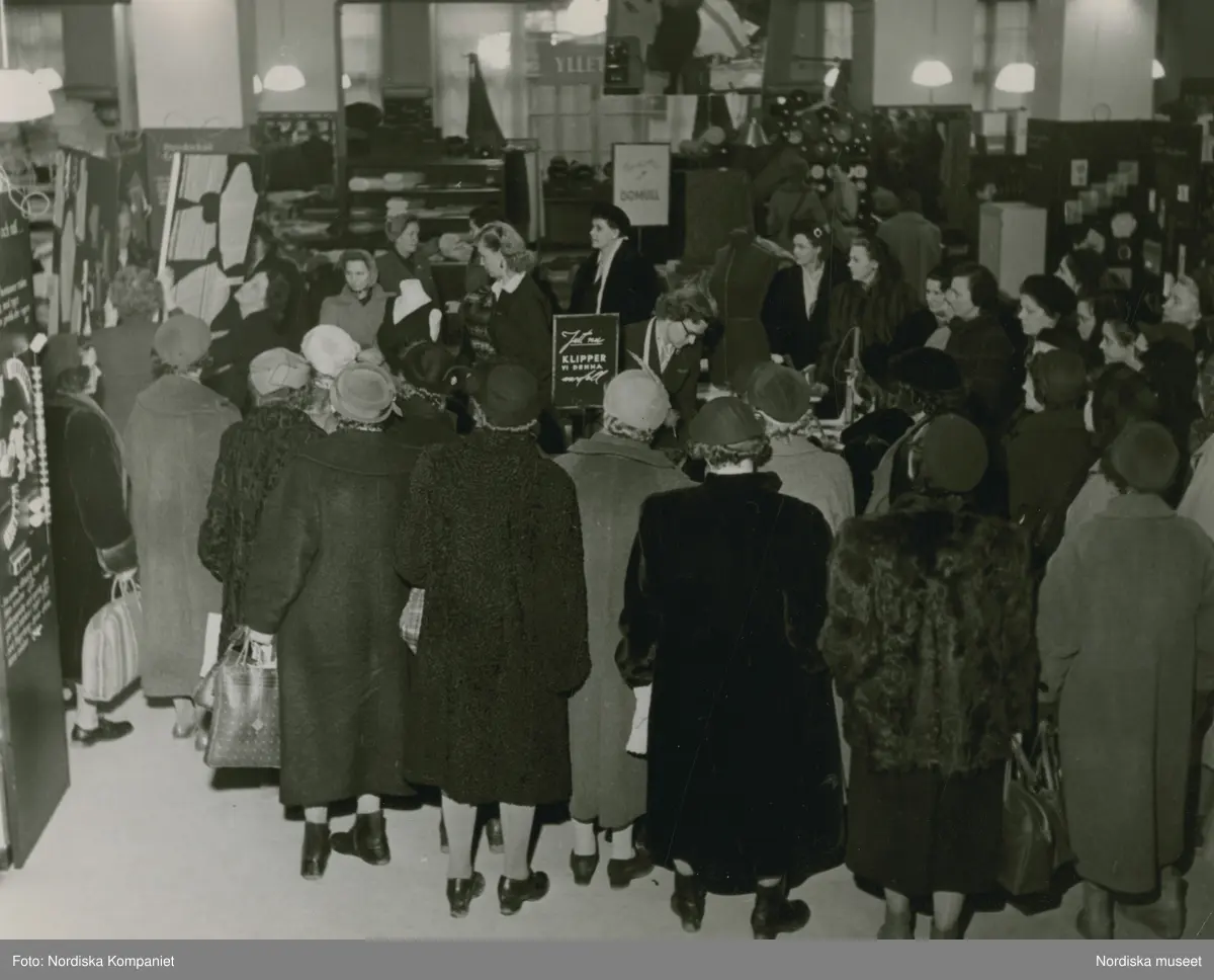 Damkonfektion. Kunder på Nordiska Kompaniet. Text med blyerts på baksidan: "Brud i Hem 1954".