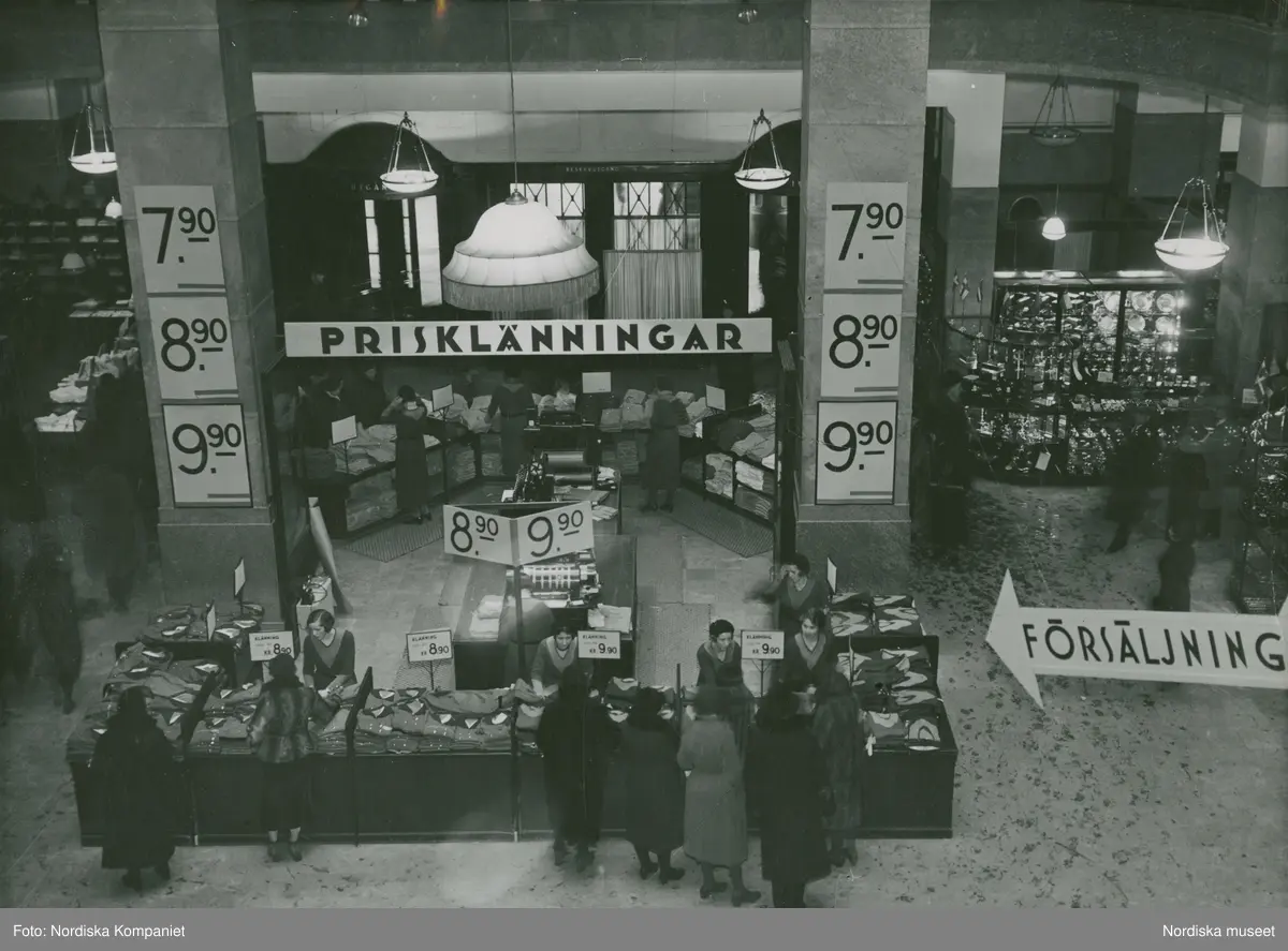 Nordiska Kompaniet. Ljusgården med försäljning av "Prisklänningar" Text med blyerts på baksidan: "Ljusgården med folk" "Mars 1932".