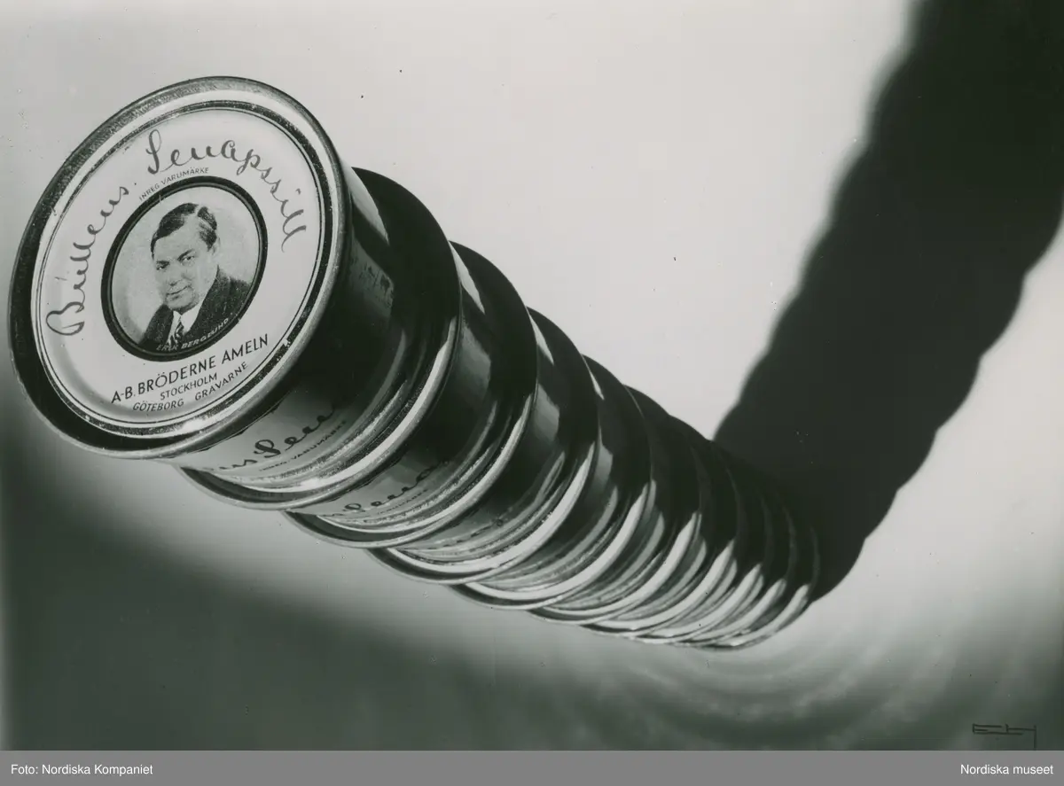 En stapel med konservburkar med Bullens senapssill, Text med blyerts på baksidan: "1932"