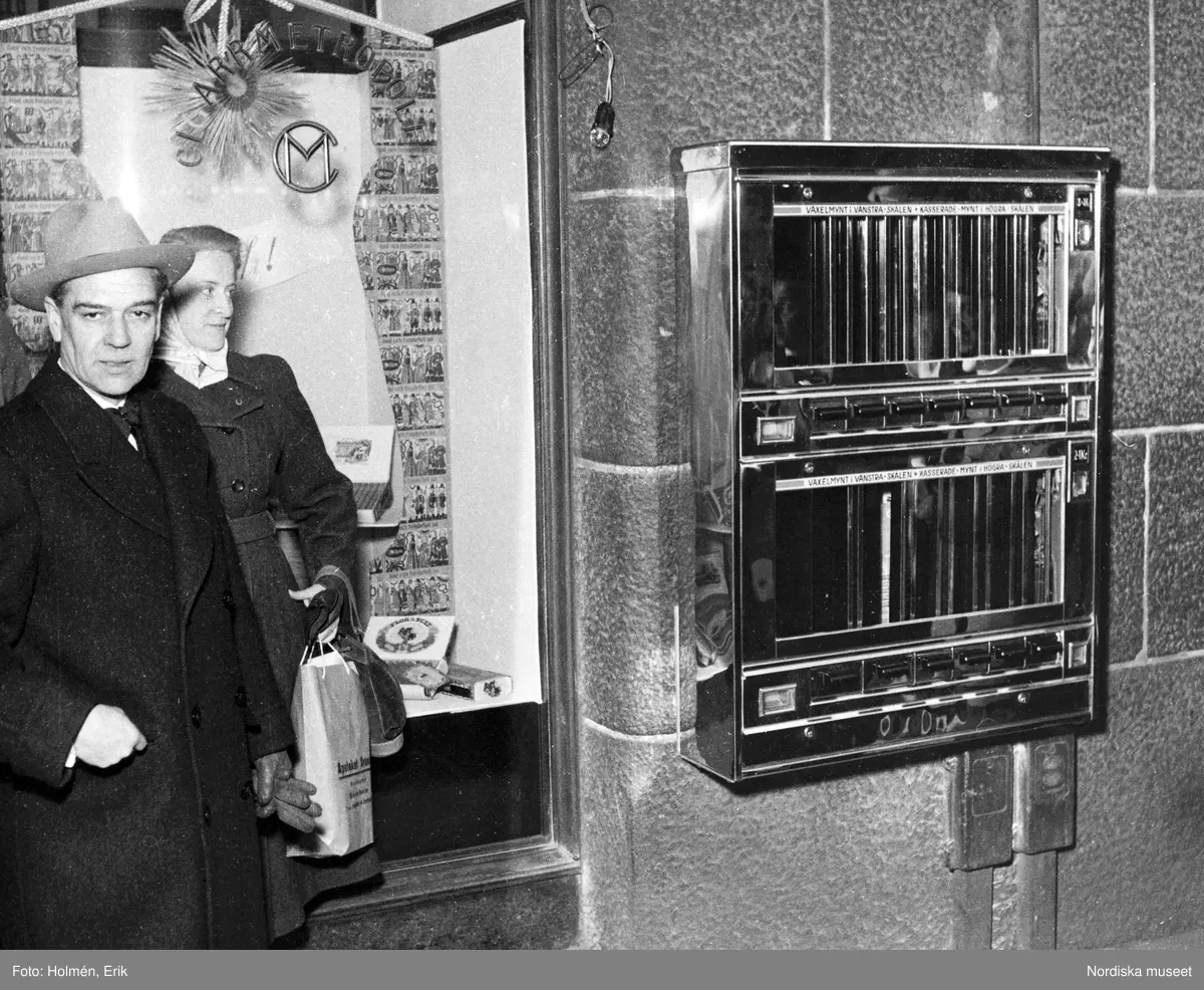 En man och en kvinna vid tobaksautomaten på Nordiska Kompaniet.