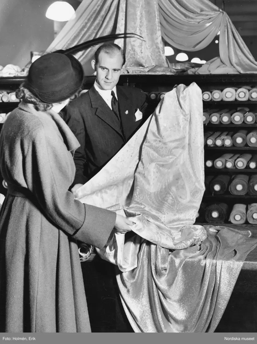 Butiksbiträde håller upp tyg för kvinna i kappa och hatt på Nordiska Kompaniets manufakturhall.