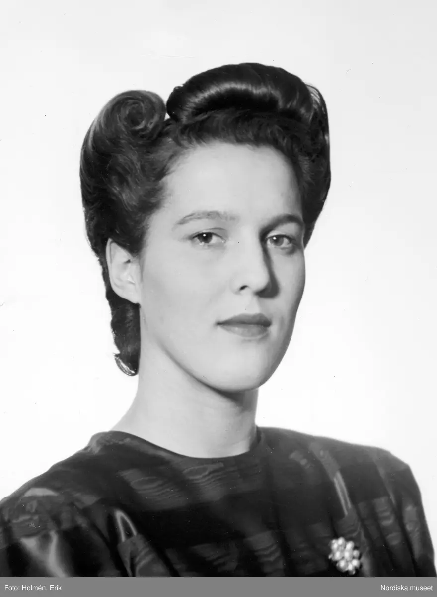 Kvinna med hårvalk, randig blus och brosch.