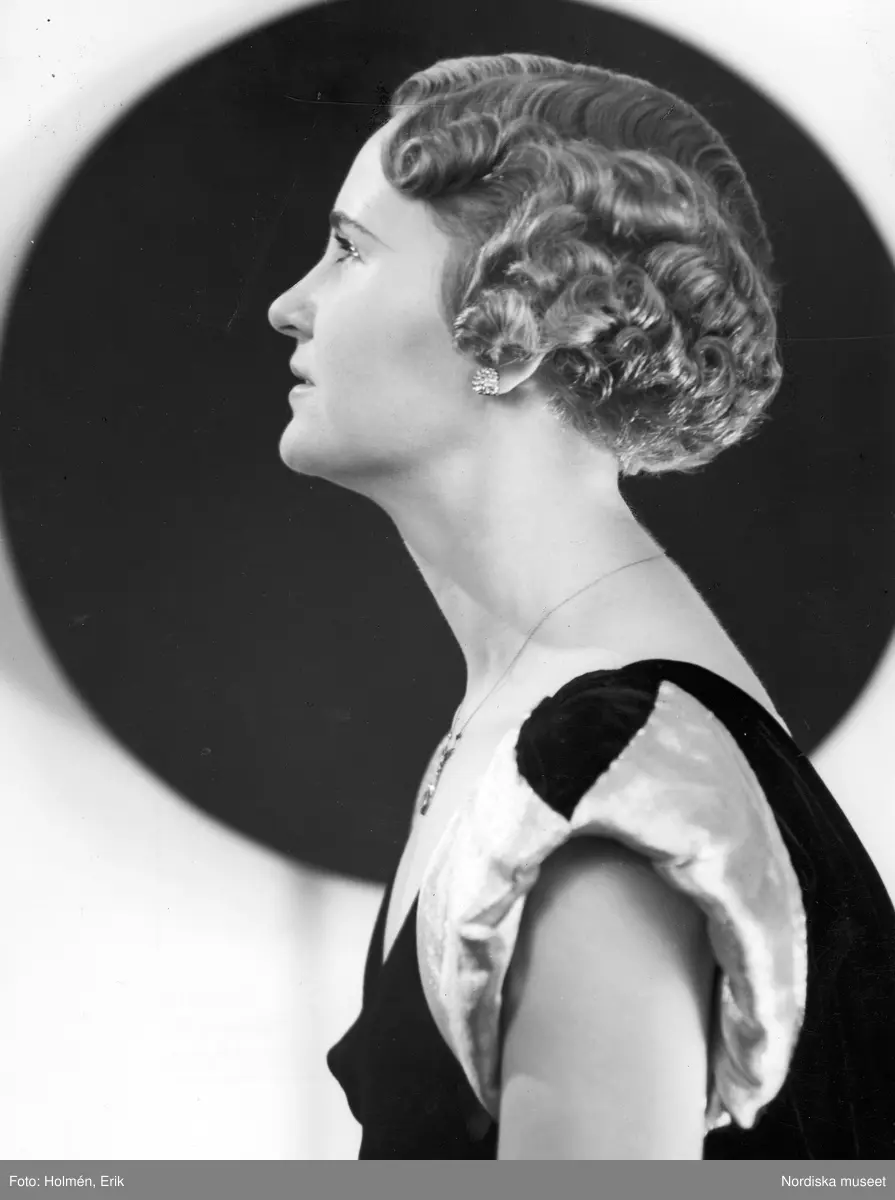 Fru M. Oldenburg i lagd frisyr, örhänge, halsband och kortärmad överdel.