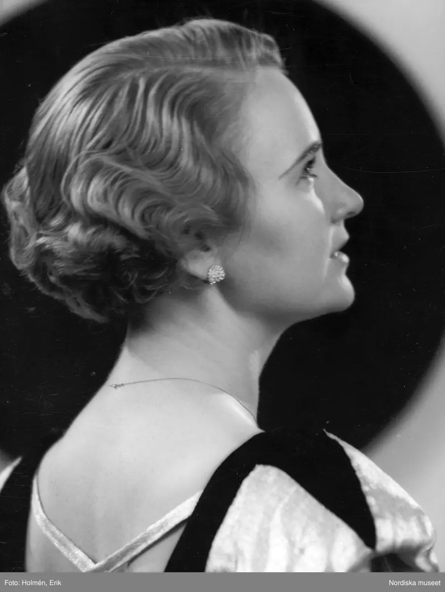 Fru M. Oldenburg i lagd frisyr, örhänge, halsband och klänning med puffärmar.