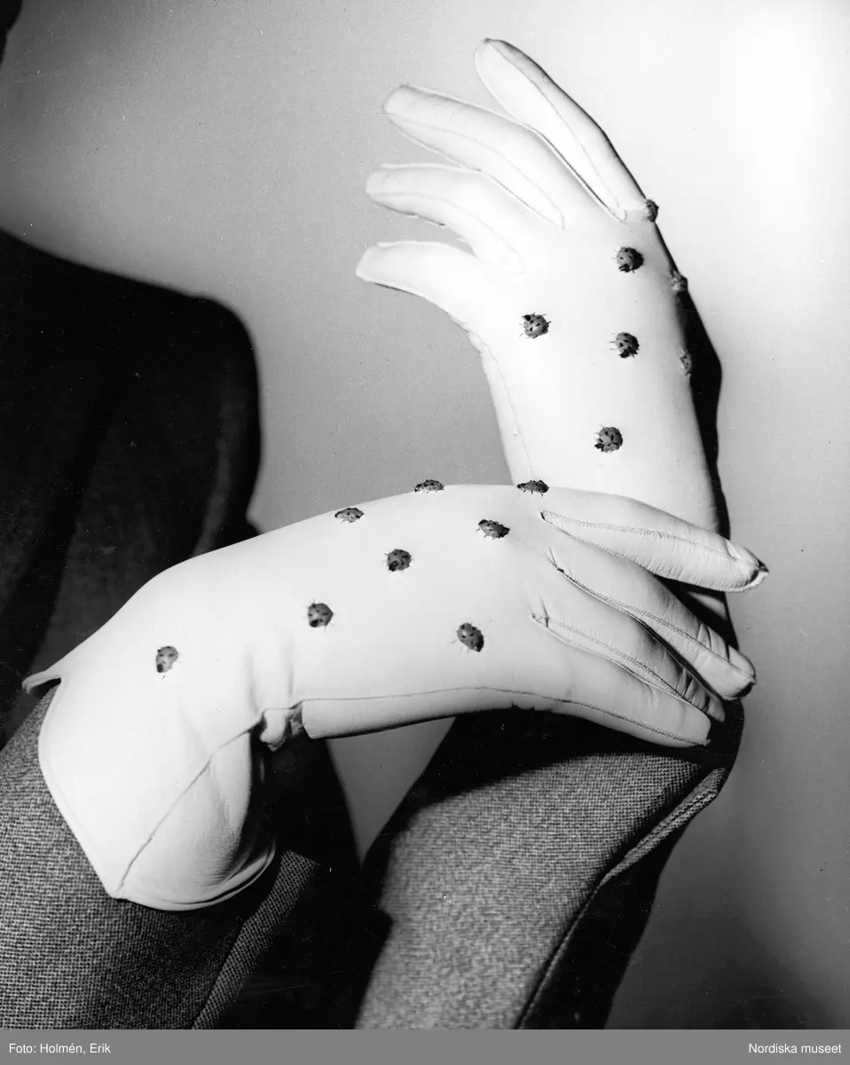 Fransk, vit glacéhandske med röda nyckelpigor.