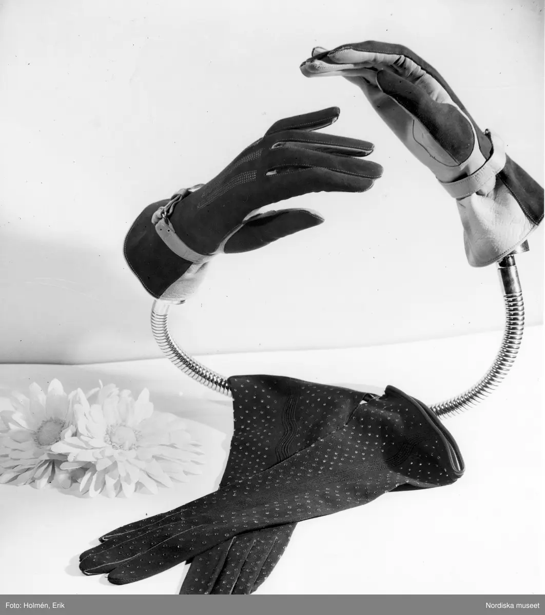 Damhandskar. Tvåfärgade skinnhandskar med remmar på ställning. Ett par perforerade handskar liggande på bordet, tillsammans med blomsterdekoration.